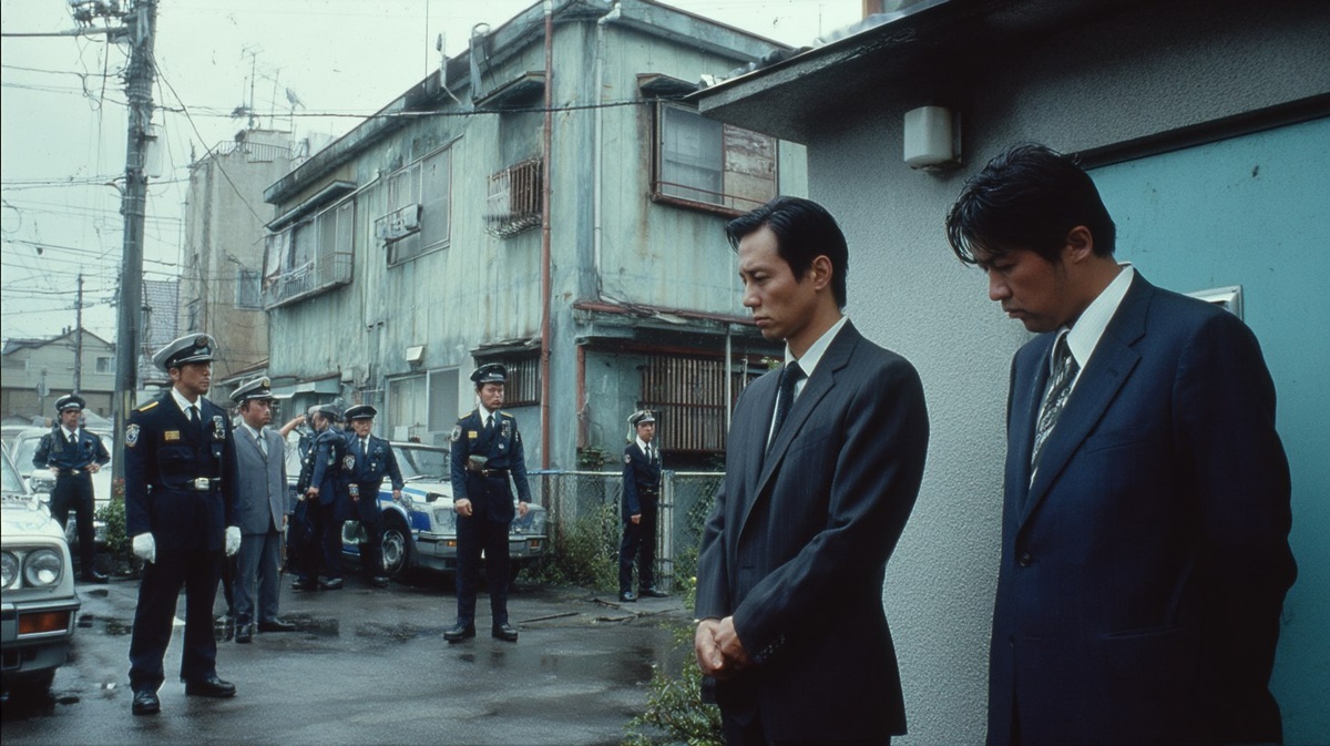 Создано на основе запроса: Two serious-looking Japanese detectives in suits standing in front of a small, slightly run-down apartment building in Japan, appearing tense as they prepare to enter. One detective is holding a police badge or warrant, the other glancing toward the door. A couple of uniformed Japanese police officers stand nearby for security, watching the surroundings. The atmosphere is tense, overcast sky, realistic lighting, cinematic photography, street-level view, dramatic and gritty tone, early Heisei era Japan, Tokyo suburb