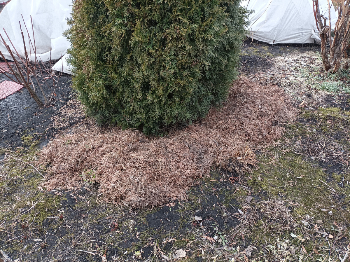Хвойные вдоль западного забора после снятия х/б тряпок, зимних накидок, выглядели идеально, с изумрудной хвоей. Только самые макушки слегка подсушены.