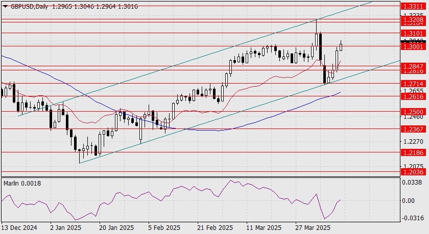 Фунт стерлингов достиг целевой уровень 1.3001. Сигнальная линия осциллятора Марлин пробивается через нулевую линию на территорию роста. Цель 1.3101 открыта. Преодоление уровня позволит отработать диапазон 1.3184-1.3208.
