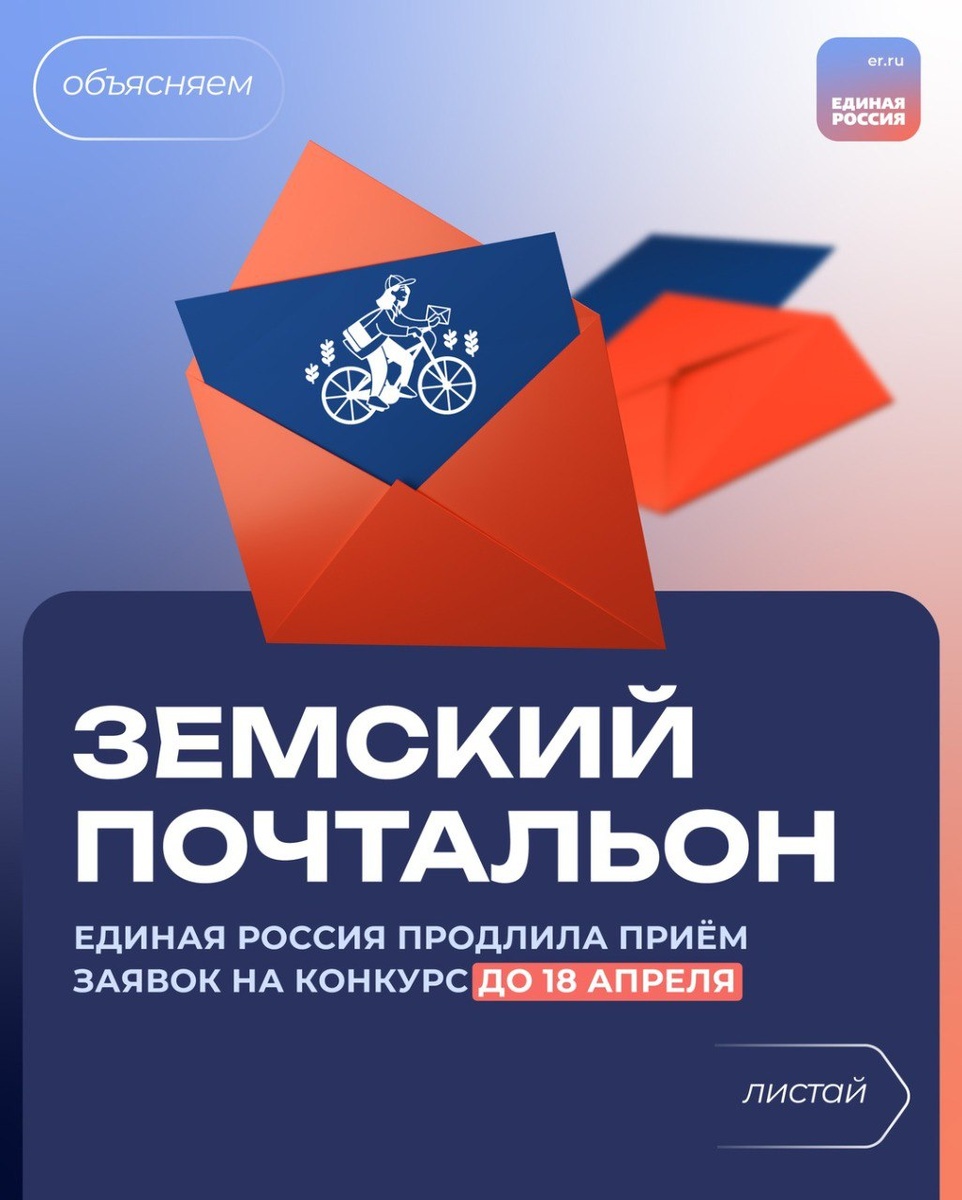 👍 Единая Россия продлила приём заявок на конкурс «Земский почтальон» до 18 апреля.