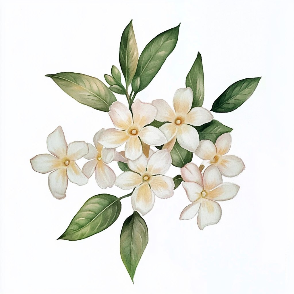 Создано на основе запроса: Watercolor, pastel painting of jasmine flowers with leaves on a white background, in the style of [Artist name].