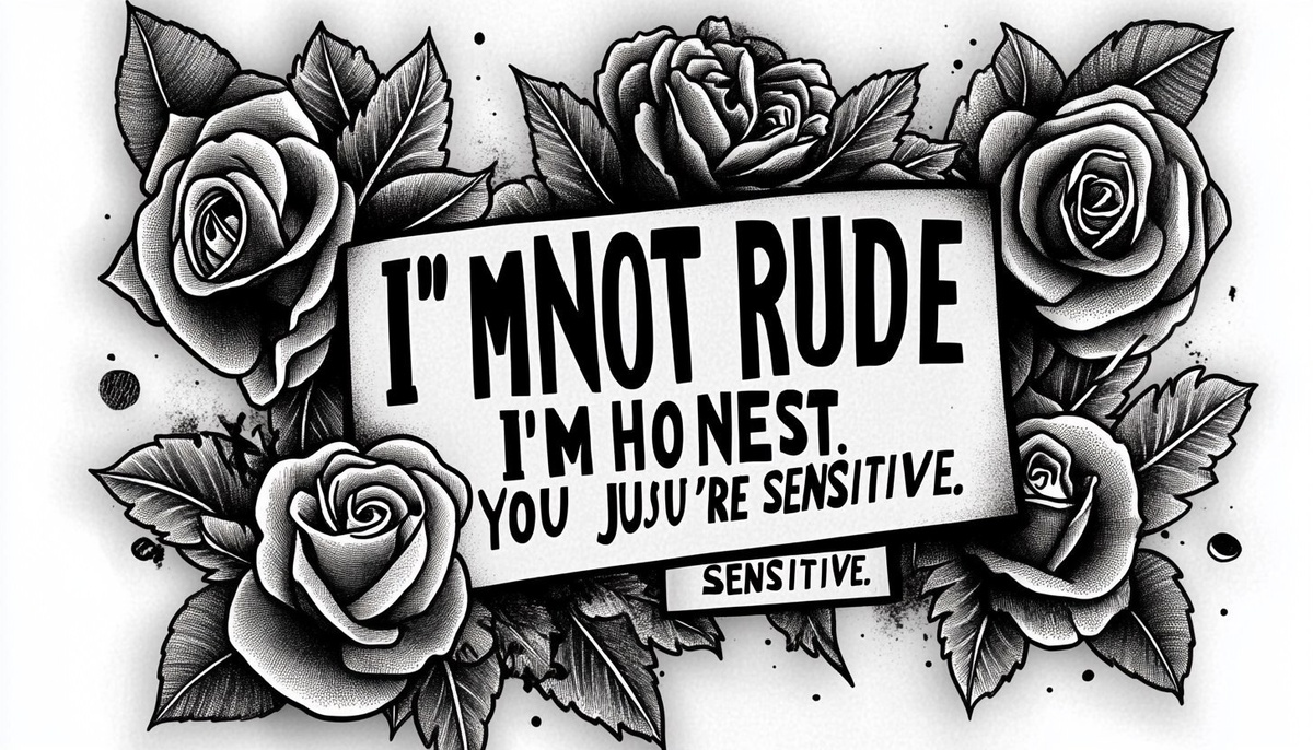 Создано на основе запроса: design of the text "I'M NOT RUDE I'M HONEST. YOU'RE JUST SENSITIVE.". In the background, black roses and leaves on white paper. Tattoo art style. --- Автоперевод: Дизайн текста «Я не грубый, я честен. Ты просто чувствителен». Круто выглядит? 🤔 https://dzen.ru/id/65c0c65c86e4f837c27b24d7 #ИИ #AI #нейросеть #midjourney #art