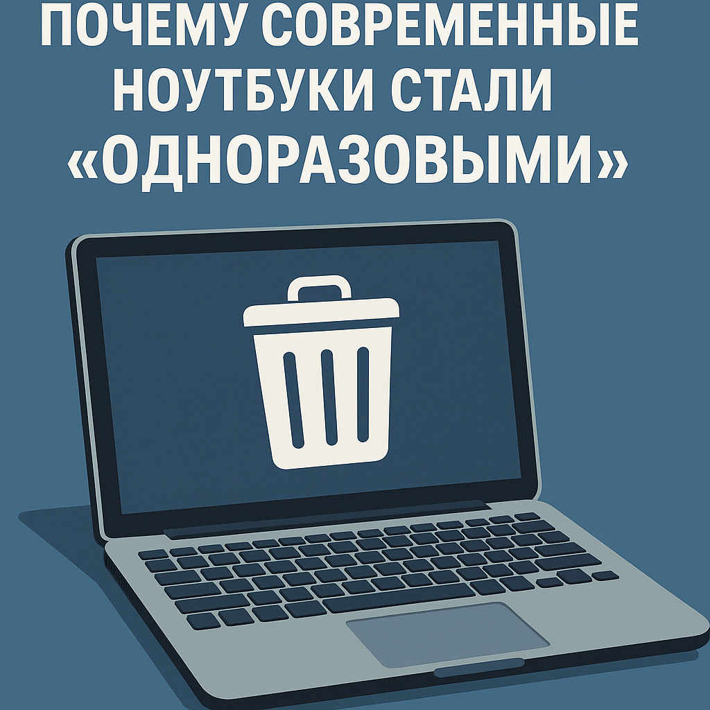 Привет, друзья. Кто ещё помнит, как ноутбук можно было разобрать за 10 минут, поменять в нём всё — от батареи до процессора — и катать дальше, как новый. А теперь? Теперь у нас ультратонкие «облака технологий»… которые ломаются раз и навсегда. Так почему современные ноутбуки — это одноразовые гаджеты, а не инструменты на годы? Разбираемся. Если раньше можно было апгрейднуть память, заменить накопитель, поставить более мощный проц или хотя бы сохранить данные, то теперь при поломке одного чипа — до свидания, вся плата. В сервисе это называют красиво — «моноблочная архитектура». Мы называем это — одноразовая плата за $1000+. Раньше вынимал батарею, купил новую на AliExpress — и всё. Теперь — чтобы заменить батарею, нужно снимать дисплей, выковыривать клавиатуру, отпаивать шлейфы, а иногда и рисковать разломать корпус. Всё ради “тонкости” и “дизайна”. Ну спасибо, Apple. Остальные, конечно, пошли следом. Пытаешься отремонтировать? Удачи. Большинство современных ультрабуков — это