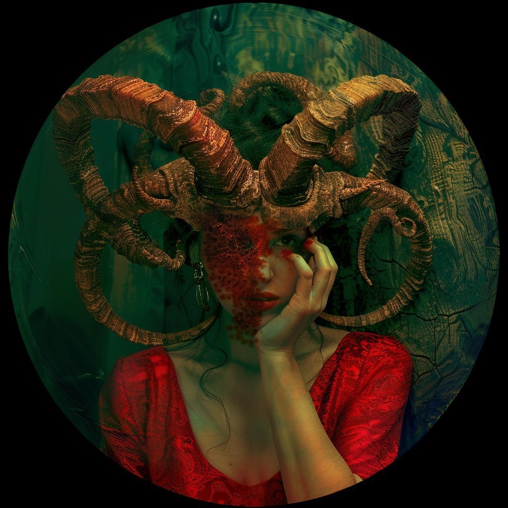Автоперевод: Женский демон, длинные скрученные рога, объемные, в красном платье, глубокие цвета, безумно реальные, безумно детализированные, смотрящие ко мне, от линзы рыбьи, психологический ужас, лицевая сторона, фрактальная, манея