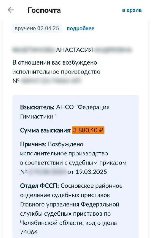 В начале апреля этого года женщина увидела на «Госуслугах» уведомление от приставов о долге перед «Федерацией гимнастики». Оказалось, ей начислили пени за то, что она на несколько недель позже оплатила занятия, остальное — судебные расходы.