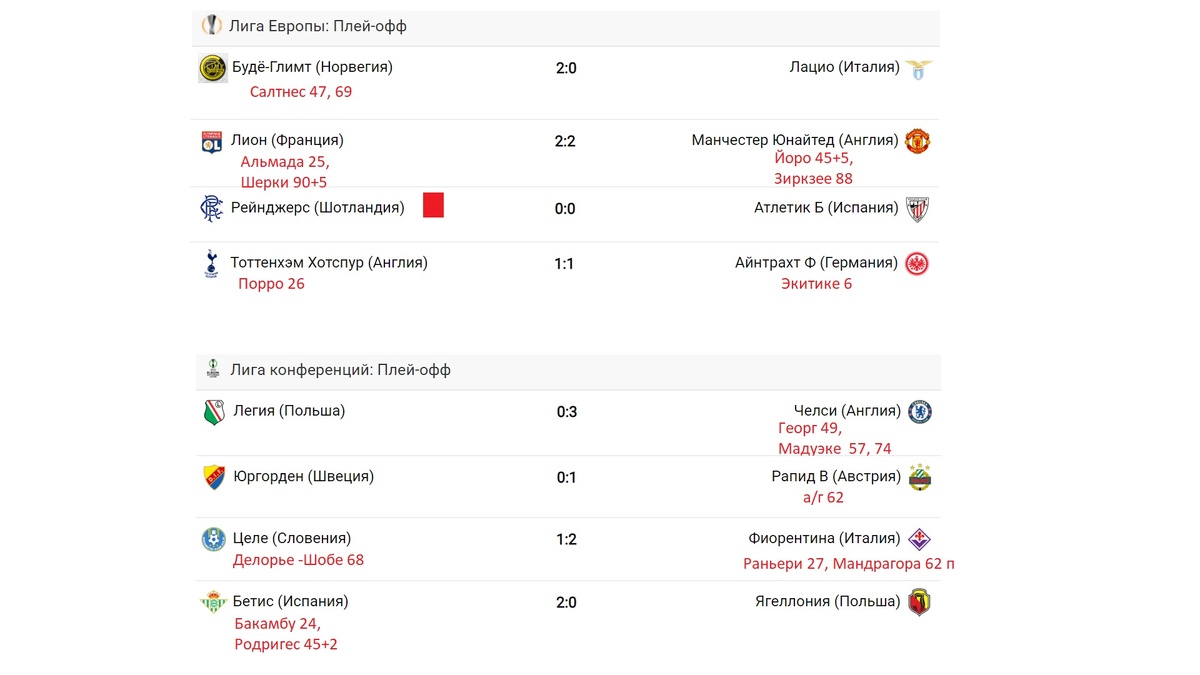 В этот четверг состоялись первые четвертьфиналы в Лиге Европы и Лиге Конференций. Рассказываю о результатах. Норвежский Будё/Глимт переиграл Лацио – 2:0. У Римлян было жалких 6 ударов за матч, и только один угодил в створ ворот. Дубль в матче оформил Салтес на 47-й и 69-й минутах. Лион вырвал в добавленное время ничью у Манчестера Юнайтед – 2:2. Первый тайм был за французами, во втором гости немного выровняли ситуацию. За англичан отметились Йоро в добавленное к первому тайму время и Зиркзее на 88-й. Рейнджерс и Атлетик Бильбао разошлись миром – 0:0. Отмечу, что шотландский клуб с 13-й минуты играл в 10-м, за подножку был удалён центральный защитник Проппер. Испанцы нанесли 19 ударов, но счет не открыли. Тоттенхэм не сумел выиграть дома у Айнтрахта – 1:1. На быстрый мяч Экитике, в середине тайма ответил Порро. «Шпоры» ни разу в истории не уступали Айнтраху, интересно узнать, проиграют на выезде? ---------------------------------------- В Лиге Конференций польская Легия крупно проиграла