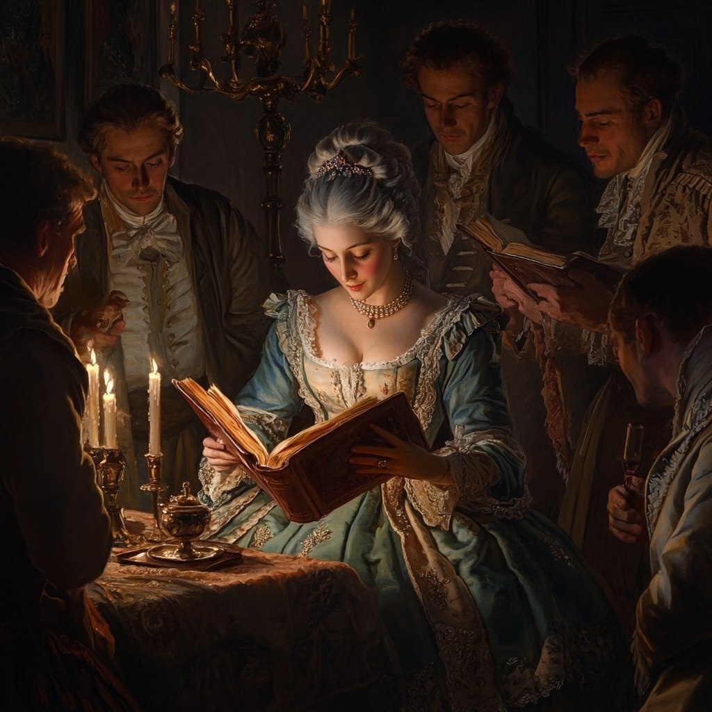 Создано на основе запроса: Elegant 18th century scene, Catherine the Great reading philosophy books, surrounded by handsome noblemen
