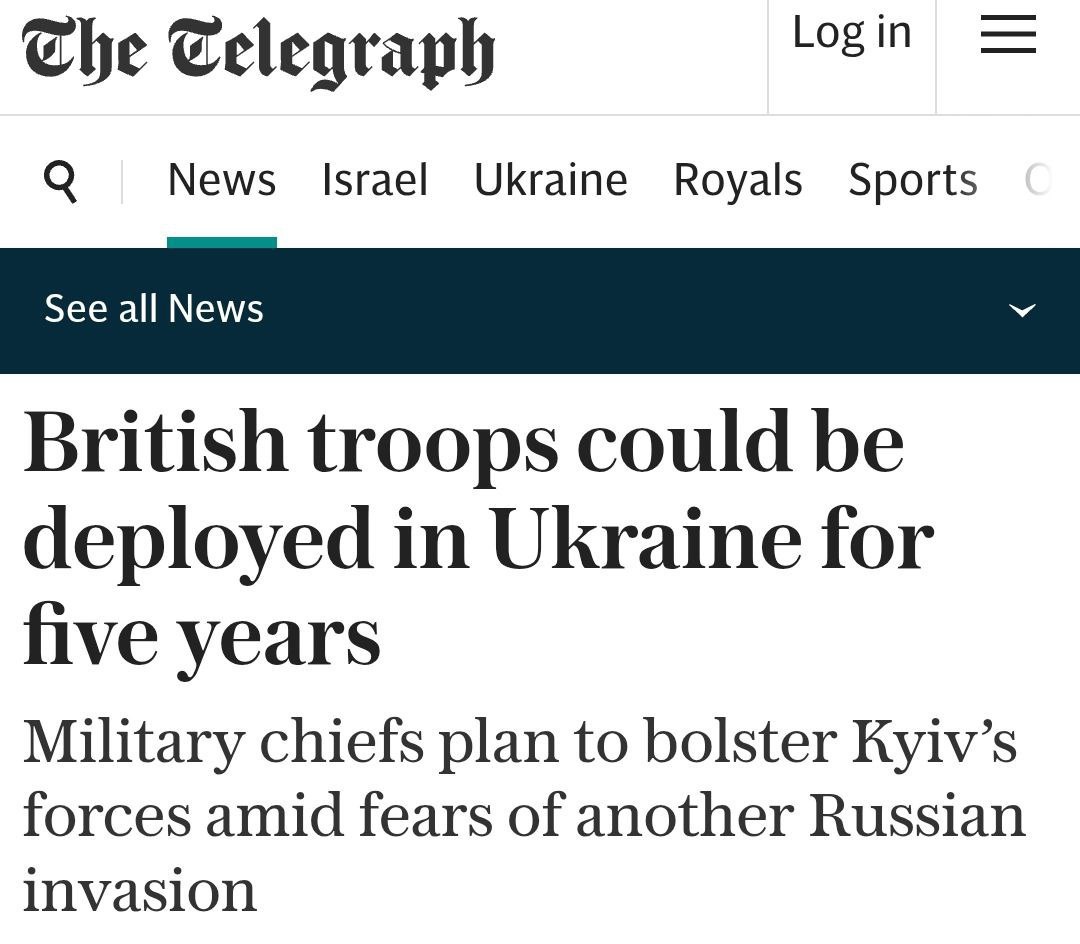Великобритания рассматривает возможность размещения на Украине своих военных подразделений на пять лет, пишет The Telegraph со ссылкой на источники. Согласно планам, цель — предоставление ВСУ «необходимой передышки». В МИД РФ тем временем заявили РИА Новости, что намерение Лондона, а также Парижа направить на Украину так называемые гарантийные силы — это подготовка иностранной интервенции. 🟩 Подписаться | Прислать новость | Читать аналитику
