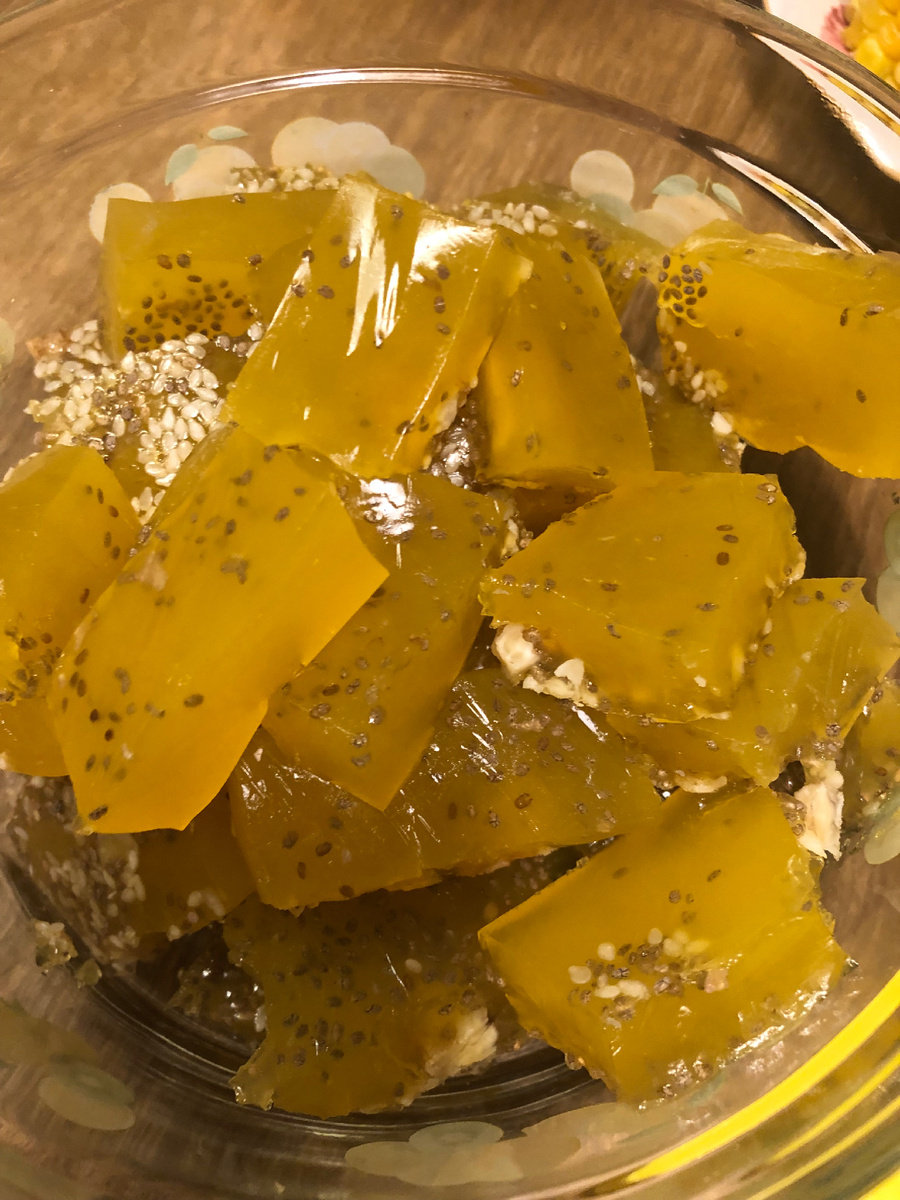 В силиконовую форму для выпечки на дно постелила пищевую пленку, насыпала семена чиа и кунжута, добавила чуть чуть грецкого ореха, залила остывший сок и поставила в холодильник. Три часа прошло, мармелад ножницами нарезала на кусочки и да, пили чай.