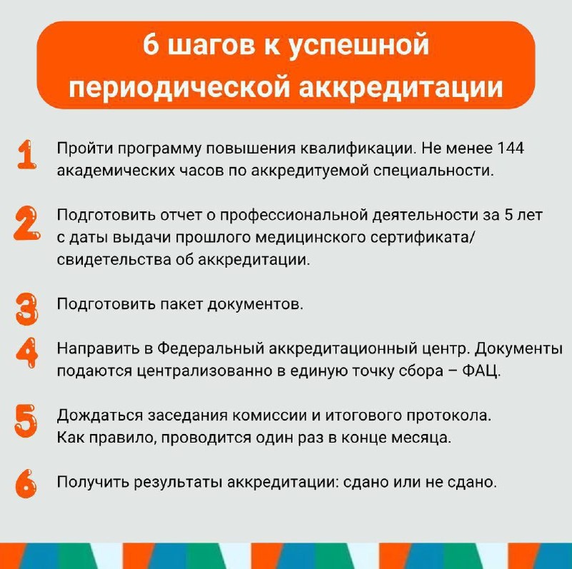 6 шагов к успешной периодической аккредитации 🔥 1️⃣Пройти программу повышения квалификации. Не менее 144 академических часов по аккредитуемой специальности. 2️⃣Подготовить отчет о профессиональной деятельности за 5 лет с даты выдачи прошлого медицинского сертификата/свидетельства об аккредитации. 3️⃣Подготовить пакет документов. 4️⃣Направить в Федеральный аккредитационный центр. Документы подаются централизованно в единую точку сбора – ФАЦ. 5️⃣Дождаться заседания комиссии и итогового протокола. Как правило, проводится один раз в конце месяца. 6️⃣Получить результаты аккредитации: сдано или не сдано. МЕДИАТОР Лицензия, ФИС ФРДО. Официальный провайдер портала НМО. Наш сайт: https://mediator-med.ru Телефон: 88001007226 Задать вопрос: @anna_nmo @nmo_akkred