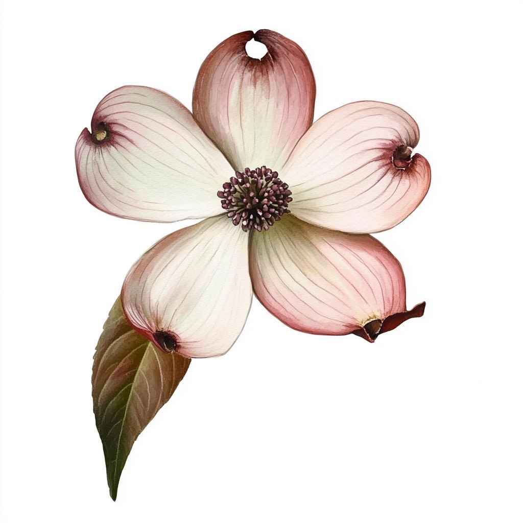 Создано на основе запроса: A single pale pink and brown dogwood flower with dark red sepals, against a white background, in the style of photorealistic watercolor.