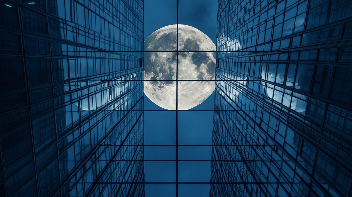 Создано на основе запроса: the moon reflected in a skyscraper, the moon has landed on earth, cinematic, photorealistic, magical, reflected