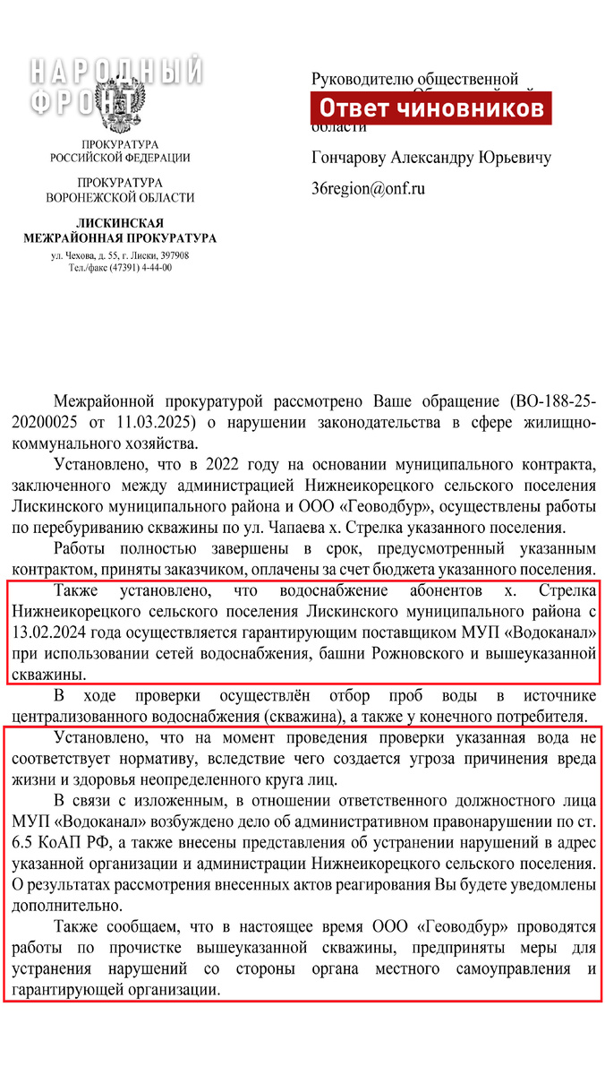 Ранее Народный фронт рассказал о том, что более 150 семей из лискинского хутора Стрелка вынуждены пользоваться не соответствующей самнормам водопроводной водой. По содержанию железа и мутности норматив превышен втрое. Местные власти на их жалобы не реагировали, поэтому люди обратились на прямую линию президента.