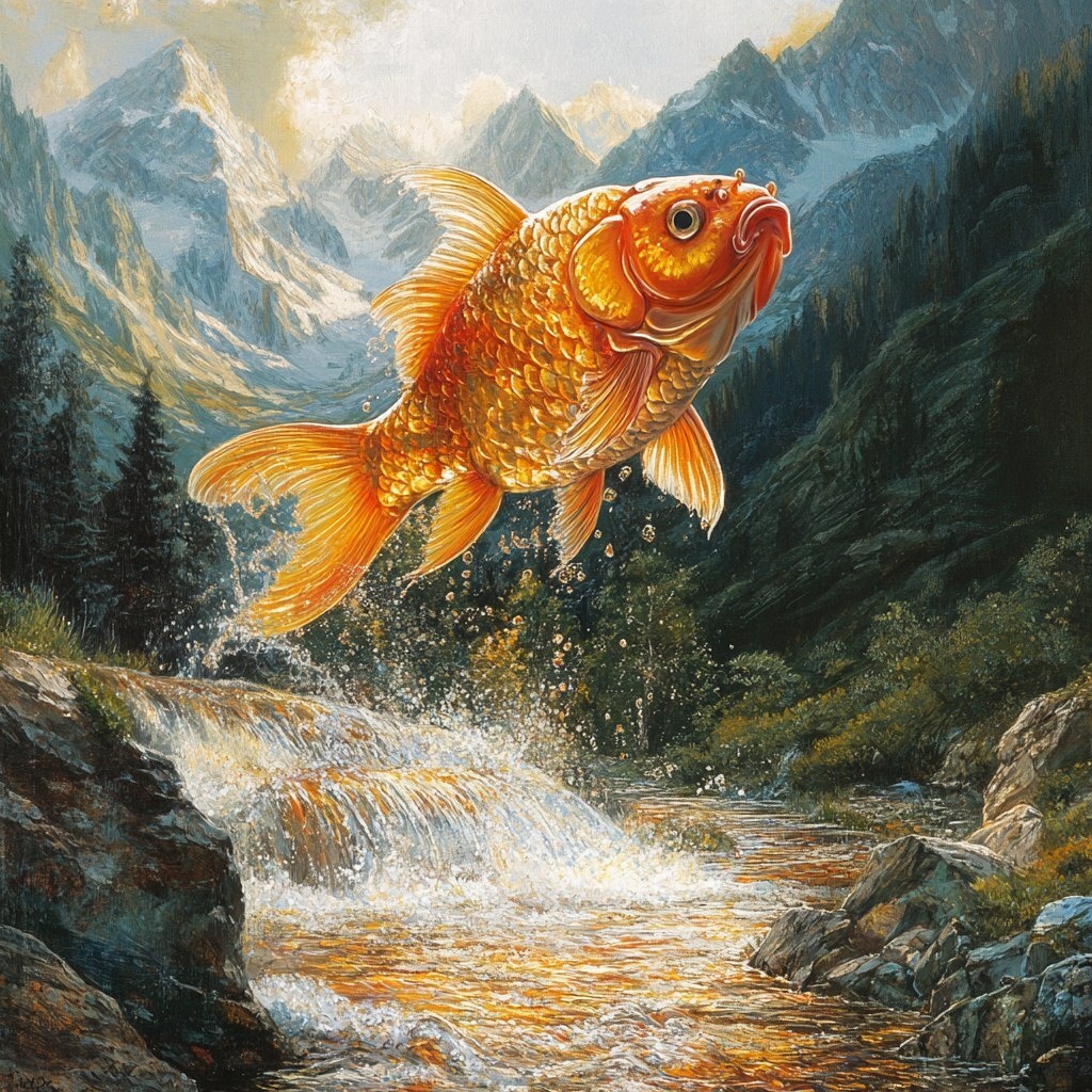 Создано на основе запроса: a goldfish jumping out of a mountain stream, large, plump, with a golden sheen of reflecting light