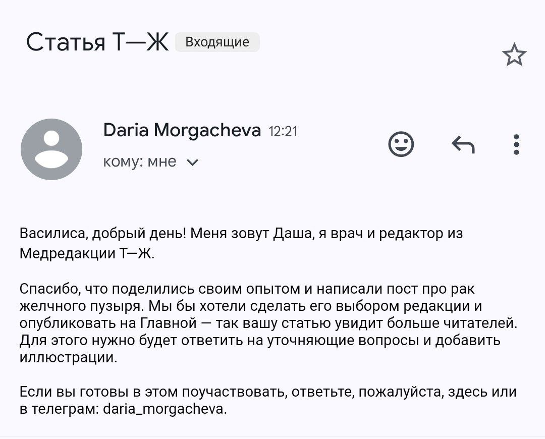 #личное Пару недель назад опубликовала в сообществе Тинькофф. Журнала сторитейл про ЗНО желчного пузыря у бабушки. Сегодня мне прислали вот такой ответ. Радости нет предела)