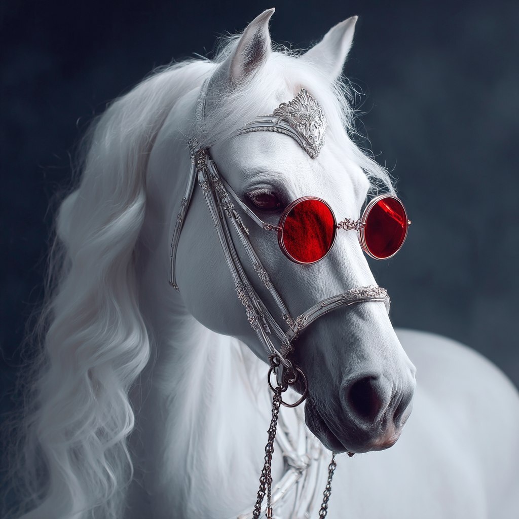 Создано на основе запроса: the beautiful white horse proudly wore red spectacles