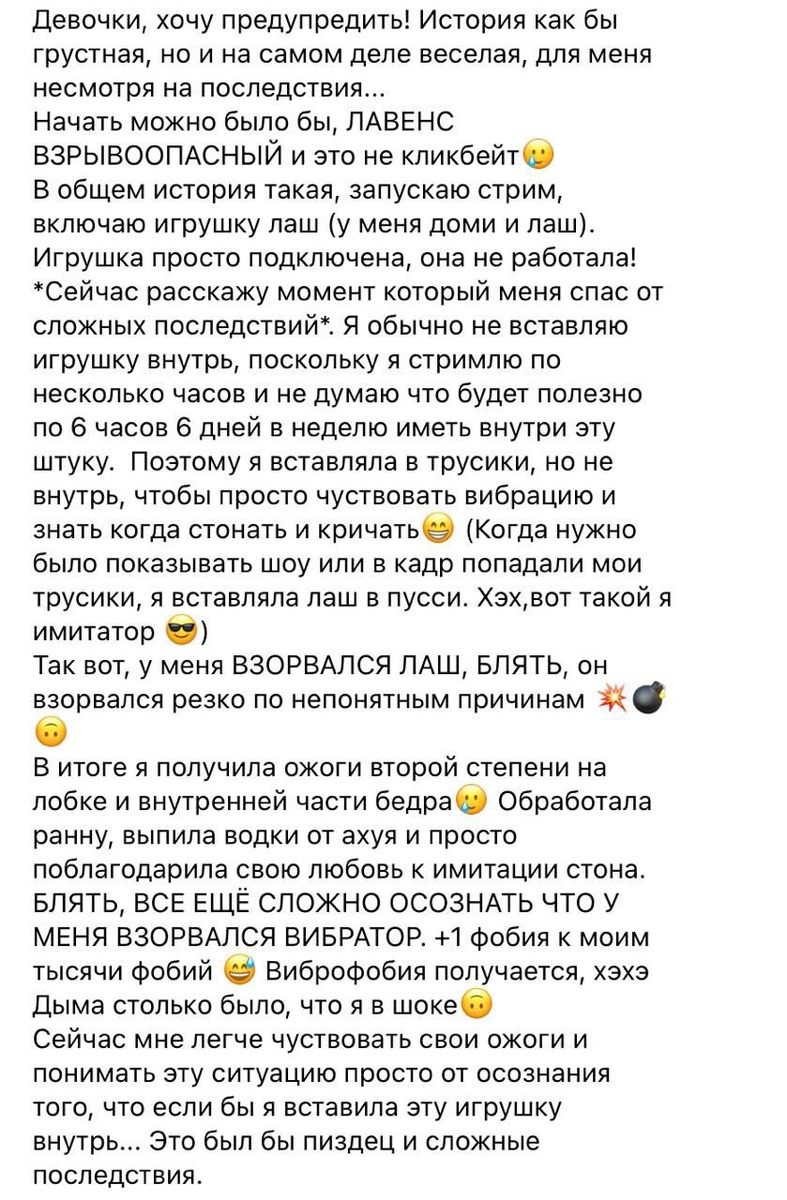 Свою историю девушка описала в одном из тематических тг-каналов, где девочки обсуждают работу в сфере 18+. С её слов, всё случилось прямо во время смены. Игрушка была не внутри, поэтому обошлось ожогами второй степени на лобке и бедре. Само устройство якобы оригинальное, использовалось аккуратно и правильно. В качестве пруфов: фоточки.