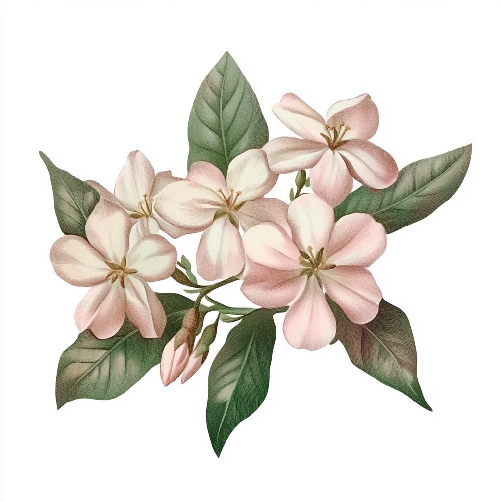 Создано на основе запроса: Vintage illustration of pink jasmine flowers, isolated on a white background, in pastel colors, in the style of a cottagecore aesthetic.