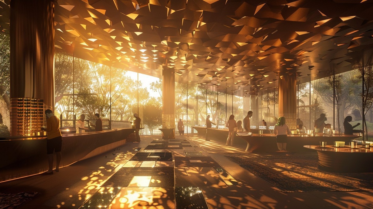 Создано на основе запроса: A panoramic artistic rendering of a collaborative Lebanese sensory lab, chefs presenting molecular takes on kibbeh, neuroscientists analyzing scent triggers, architects creating multi-sensory spaces using ancient Levantine geometry. Background showing cedar forest outside glass walls, traditional carpets on floor, sound-reactive lighting system. Soft golden hour light, earthy color palette, warm shadows. Created Using: Drone photography, Levantine geometry, multi-sensory rendering, gastronomy art styling, ambient motion blur, kinetic light simulation, handwoven texture mapping --- Автоперевод: Панорамный художественный рендеринг совместной ливанской сенсорной лаборатории, повара, представляющие молекулярные взгляды на киббе, нейробиологи, анализирующие триггеры аромата, архитекторы создают мультисенсорные пространства с использованием древней левантиновой геометрии. Необычно вышло? 🤔 https://dzen.ru/id/65c0c65c86e4f837c27b24d7 #ИИ #AI #нейросеть #midjourn