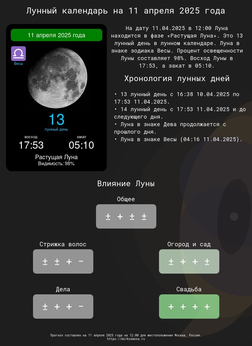 Лунные календари на 11 апреля 2025 года: Подготовьтесь к этому дню с учетом влияния Луны! 🔹🌗 Лунный календарь на 11 апреля 2025 года — Что приготовила Луна? Подробнее 🔹✂️ Лунный календарь стрижек на 11 апреля 2025 года — Подходящий ли день для обновления прически? Подробнее 🔹🌱 Лунный календарь огородника и садовода на 11 апреля 2025 года — Лучшее время для ухода за растениями. Подробнее 🔹📅 Лунный календарь дел на 11 апреля 2025 года — Удачные моменты для важных задач. Подробнее 🔹💍 Лунный календарь свадеб на 11 апреля 2025 года — Подходит ли этот день для вашего торжества? Подробнее