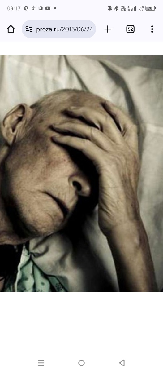Я поднялась на крыльцо, несколько секунд постояла перед дверью, за дверью царила тишина. И тут дверь неожиданно открылась передо мной стояла взволнованная бабушка, она облегчённо сказала, - Лариса, пришла, спаси ради Бога деда моего. Прошли с ней в спальню, на кровати на боку лежал худой старик с тёмно синим лицом, и с большим напряжением дышал с тонким свистом, через микроскопическое отверстие, которое сохранилось видимо в его трахее, Дышал натужно произнося поневоле свистящие звуки: - Иииииии.... - При вдохе, и Ууууууу...- при выдохе: - Давно он так посинел? - спросила я. - Да минут пять как - Ответила бабушка. - Наверно отёк нарастает- Подумала я.