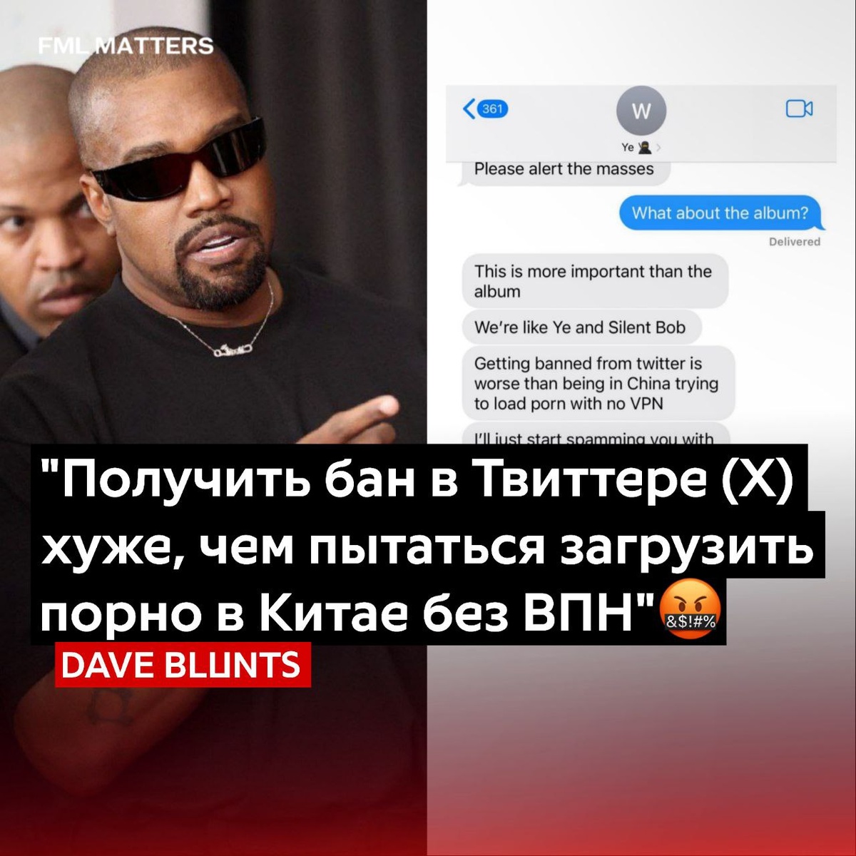 В ответ на пост ⛔️ KANYE WEST БЫЛ ЗАБАНЕН В ТВИТТЕРЕ! Об этом сообщил Дейв Блантс в своих соцсетях. Йе опубликовал более 300 твитов меньше чем за сутки. Видимо у него получилось поставить новый рекорд, и главным призом оказалась — временная блокировка аккаунта. 💀 FML MATTERS