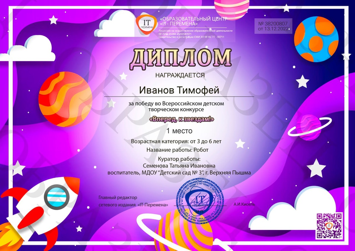 Открыта регистрация на бесплатный Всероссийский детский творческий конкурс в честь дня космонавтики «Вперед, к звездам!»! 12 апреля — особенный день, когда весь мир вспоминает о первом полёте человека в космос. Это день мечтателей, первооткрывателей и смелых исследователей далёких галактик! А ты когда-нибудь представлял, каково это — отправиться за пределы Земли и ступить на неизведанную планету? Приглашаем тебя принять участие в творческом конкурсе «Вперёд, к звёздам!», где ты сможешь показать, каким ты видишь будущее космических путешествий. Изобрази невероятный полет к далеким мирам, жизнь на других планетах, фантастические корабли и загадочные создания, которые ждут нас среди звёзд. Электронные наградные документы - бесплатно! Заявки принимаются до 16 апреля 2025 года. Ссылка на конкурс: https://itperemena.ru/kzvezdam