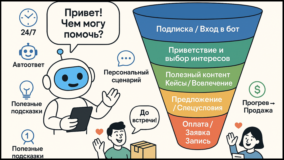 Если раньше продажа строилась на личной встрече или длинной переписке, то сейчас важно выстраивать умные касания. Боты и автоворонки — не замена людям, а усиление вашей воронки. Это — инструмент, который позволяет масштабировать процессы без потери качества, а именно: