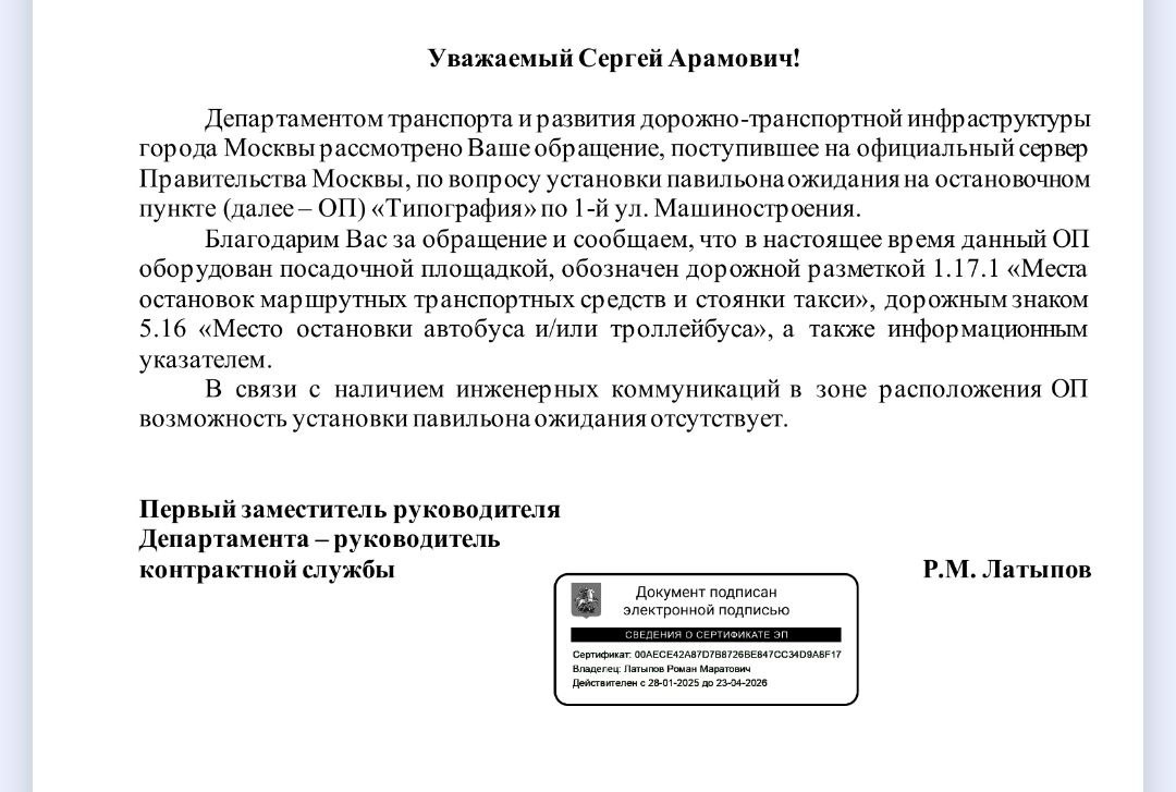 Вот так вот и бывает с развитием транспортной инфраструктуры в Москве. Место для остановки есть. Знак есть. А если хочется больше удобств в виде остановочного павильона, то в игру вступают инженерные коммуникации. Направил повторный запрос с целью разъяснений, а где можно вообще установить павильон на этой стороне. #ЛДПР #Южнопортовый #БагянСергей