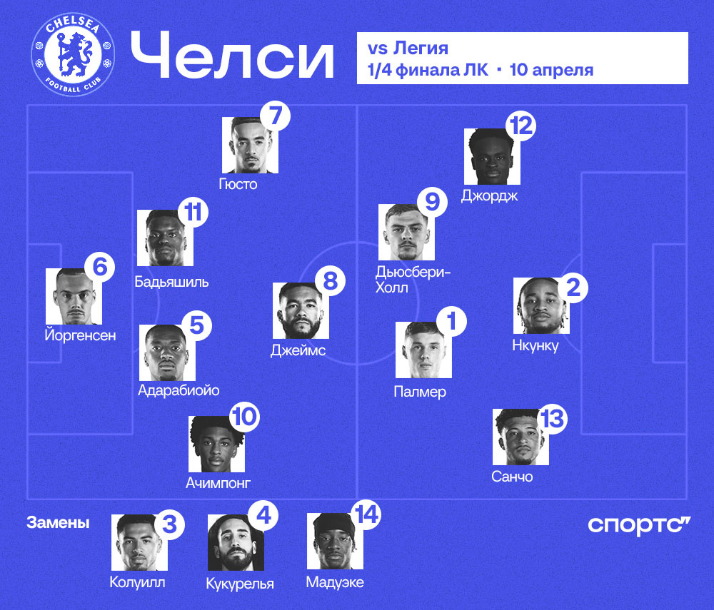 Трешка в первой встрече четвертьфинала! Филип Йоргенсен: всего один сейв, но какой важный (в концовке)! А еще у него 25 из 25 точных передач. Бенуа Бадьяшиль: убедительный матч в обороне (2 из 3 выигранных единоборств, 2 отбора, 4 выноса, 7 возвратов владения). А еще больше всех точных передач (131 из 139). Джош Ачимпонг: по ощущениям куда увереннее чувствует себя на правом фланге обороны. Тут и точность передач в 97%, и больше всех обводок за матч (2), и 4 выигранных единоборства (правда столько же и проиграл). Двигал мяч уверенно, возвращался назад убедительно. Рис Джеймс: в порядке в плане обводок (тоже 2), 3 выигранных единоборства и 5 возвратов. Без мяча нельзя сказать что сыграл идеально, но с мячом был уверенным и двигал команду вперед. После его удара с добивания как раз отличился Джордж. Джейдон Санчо: опять не бил сам (один удар за игру), но создал много для партнеров. У Санчо пять созданных голевых моментов, два отличных ассиста на Мадуэке. Коул Палмер: потерялся. 42 касания