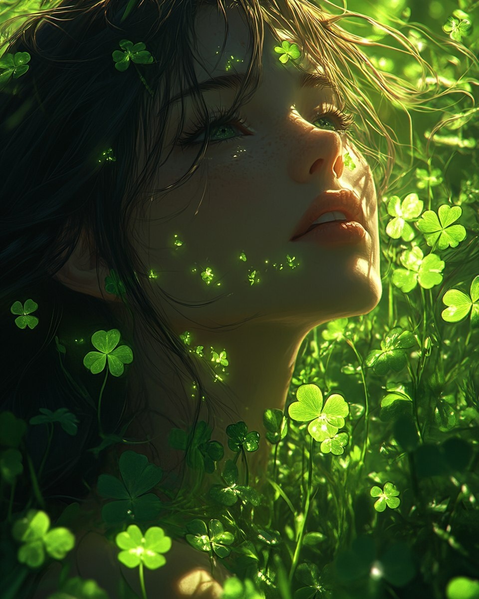 Создано на основе запроса: Japanese anime-style illustration, dreamy atmosphere, a field of four-leaf clovers, a single woman's hand