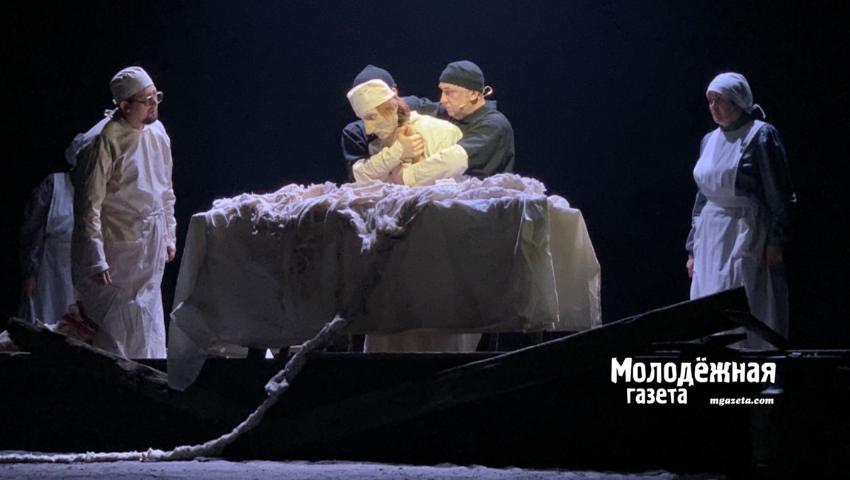 Как в драматическом театре можно наглядно показать девушку, попавшую на поле в мялку, перемолотившую ей ноги? В кукольном на операционный стол приносят груду тряпья с длинной, волочащейся по полу косой. И врач начинает собирать это рванье в единый кокон, очень сомневаясь, что красавица выживет. Это была первая в его практике ампутация, но своей восхищенной команде он немного приврал с нумерацией. Сам от шока не отошел.