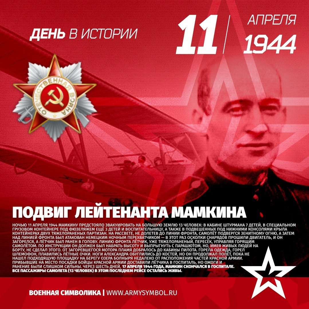 Подвиг лейтенанта Мамкина в 1944 Ночью 11 апреля 1944 Мамкину предстояло эвакуировать на Большую землю 13 человек: в кабине штурмана 7 детей, в специальном грузовом контейнере под фюзеляжем ещё 3 детей и воспитательницу, а также в подвешенных под нижними консолями крыла контейнерах двух тяжелораненых партизан. На рассвете, не долетев до линии фронта, самолёт подвергся зенитному огню, а затем над линией фронта был атакован немецким ночным перехватчиком — в этот раз осколки снарядов прошили двигатель, и он загорелся, а лётчик был ранен в голову. Линию фронта лётчик, уже тяжелораненый, пересёк, управляя горящим самолётом. По инструкции он должен был набрать высоту и выпрыгнуть с парашютом, но, имея живых людей на борту, не сделал этого. От загоревшегося мотора пламя добралось до кабины пилота. Горела одежда, горел шлемофон, плавились лётные очки. Ноги Александра обуглились до костей, но Показать полностью... Подпишитесь на наши группы ВКонтакте и в Одноклассниках - читайте, смотрите и к