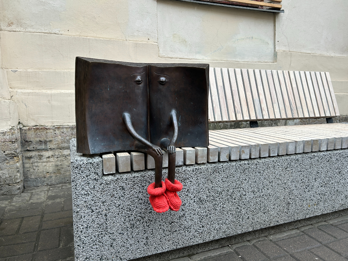 Грустная малышка-книга в милых вязаных пинетках годами сидит на лавочке во дворе типографии и кого-то ждет. Она похожа на ребенка в детсадовской группе, которого забирают последним. Идея такой чудесной скульптуры возникла не на пустом месте: в XIX веке Николай Некрасов потерял здесь рукопись Чернышевского. Ее нашли, но она, вероятно, точно так же печально сидела на лавочке и ждала. А еще бумажная книга грустит потому, что многие современные люди предпочитают литературу на электронных носителях.