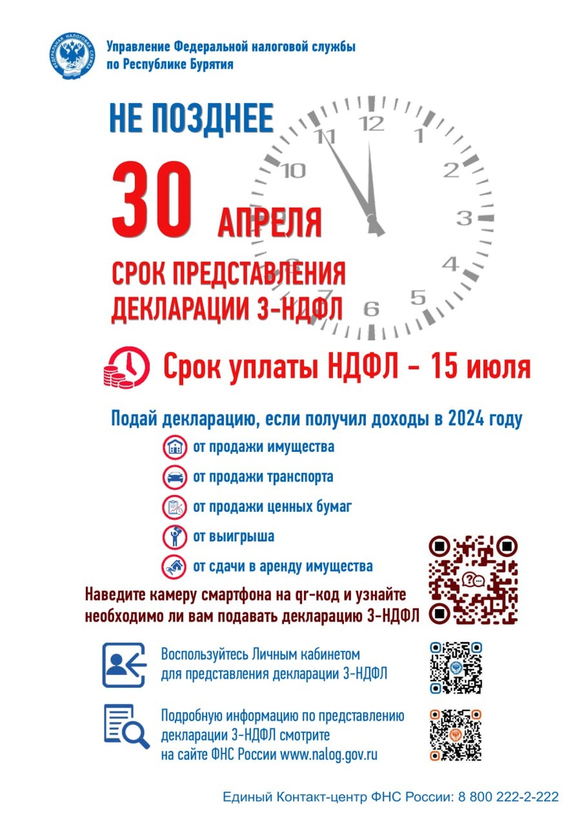 Важно: декларация 3-НДФЛ - до конца апреля. До 30 апреля 2025 года необходимо представить налоговую декларацию по форме 3-НДФЛ за 2024 год. Срок уплаты налога на доходы физических лиц - до 15 июля 2025 года. По всем вопросам, связанным с представлением декларации, обращайтесь в Управление Федеральной налоговой службы. Подробная информация - на официальном сайте ФНС России: www.nalog.gov.ru 🫡Администрация Селенгинского района. Подписаться