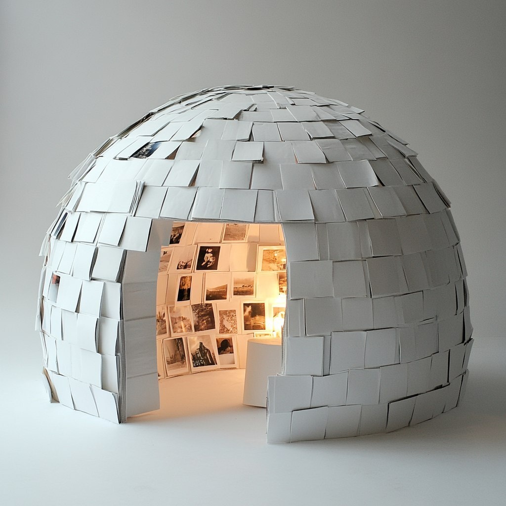 Создано на основе запроса: Create a Dome made of White Rectangular cartons. The architecture is looking like an Iglu. Outside White, Inside Full Immersion with Pictures. Every carton has a picture inside. --- Автоперевод: Создайте купол, изготовленный из белых прямоугольных коробок. Необычно выглядит? 🤔 https://dzen.ru/id/65c0c65c86e4f837c27b24d7 #ИИ #AI #нейросеть #midjourney #art