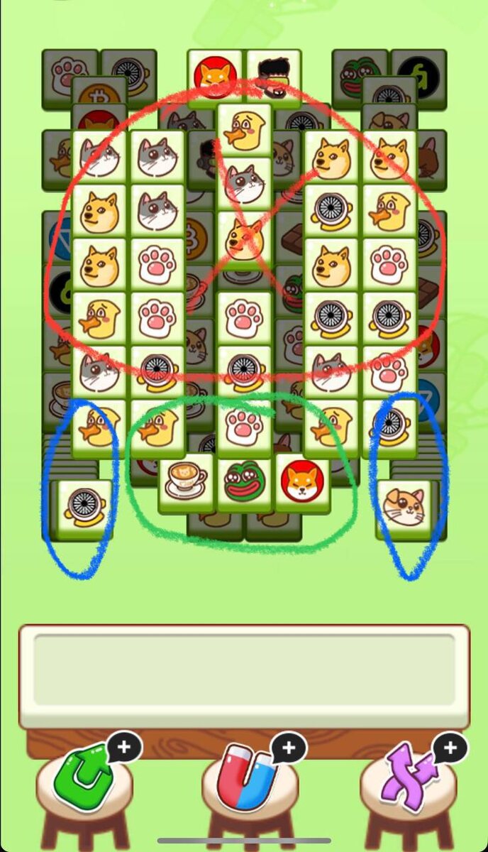 Как побеждать в 🪙 Cattea 11 апреля? 1) Наша главная цель сегодня - это красная зона по центру, в форме буквы Х. Разбираем красную зону в количестве 15 триплетов, далее подключаем Синие зоны. 2) После разбора 15 триплетов, подключаем синие зоны. Разбираем в соотношении 2 к 1 - 2 карты из красной зоны, 1 из синей зоны. 3) Зеленая зона сегодня внизу, старайтесь держать зеленую зону до поздней игры. Всем удачи!
