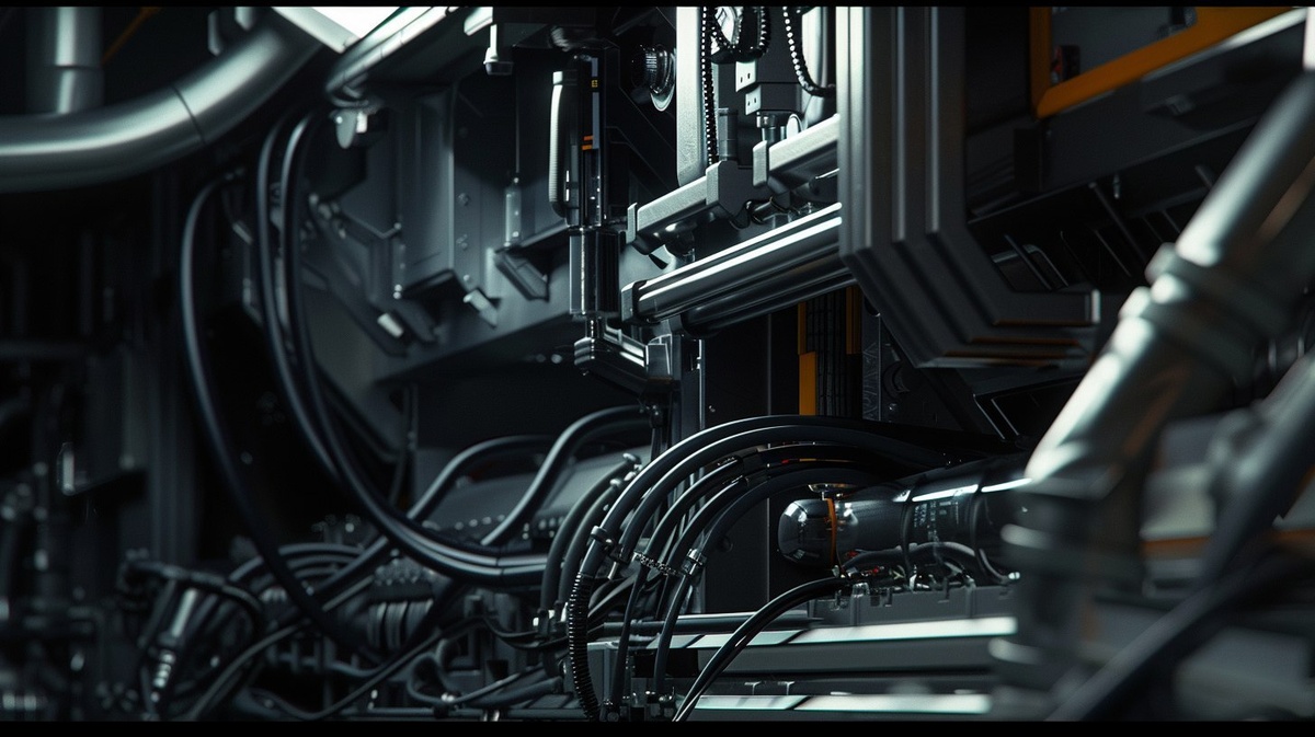 Создано на основе запроса: industrial factory interior, close-up on pneumatic systems, visible air tubes and connectors, realistic lighting