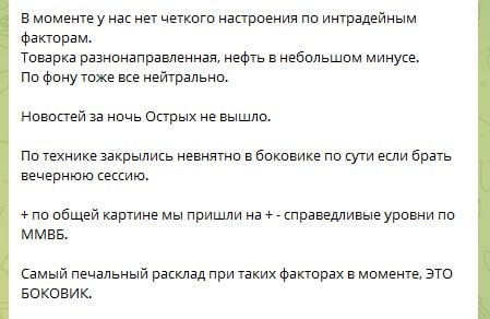 🆘Друзья, хочу объяснить вам логику сегодняшней сессии в рамках интрадея!! 👆См скриншот с куском плана из закрытого ТГ канала. ___________ ❗️Сегодня ДО начала сессии было понятно что день будет ватным тк как у нас нет ни острых новостей, не острой совокупности факторов. А ММВБ торгуется + - на справедливых уровнях. ⏺И начать движуху сегодня могла только новость либо смена рыночного фона. ⏺Поэтому на Утренней сессии мы не заходили и оказались правы тк как утренняя сессия по сути простояла в боковике без объема ДО выхода новости. __________ И на сегодня у нас был Такой расклад: ⏺Стоим на месте . ⏺Вышла новость про встречу Путина и Чувака из США на этом вынесли вверх ⏺Затем все слили и встали в боковик ⏺Затем негатив про пошлины Китая, вынос вниз, все откупили и встали в боковик. ⏺Сейчас опять выносят на новостях о встречи)) И все это время фон и товарный рынок постоянно меняется с + на )) По сути сегодня размотало и лонг и шорт. _______ ⏺Лично я работал ОТ шорта от ПИКА АТР по ММВБ