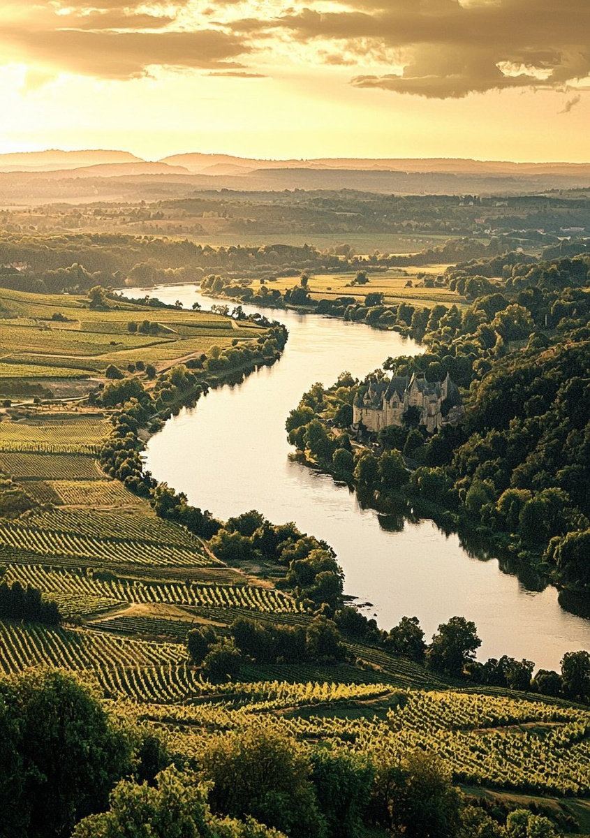 Создано на основе запроса: A breathtaking hyper-realistic panoramic photograph of the Loire Valley during golden hour, designed for a tourism poster. The entire image is bathed in rich, golden light, enhancing every detail with warmth and vibrancy. The landscape stretches majestically across the frame: rolling vineyards glowing with sunlit greens and ambers, grand châteaux perched atop gentle hills, and the serene Loire River winding gracefully through the valley, its surface gleaming with crystal-clear reflections. The atmosphere is crisp and luminous, with no mist or haze --- Автоперевод: Захватывающая гиперреалистичная панорамная фотография долины Луары во время золотого часа, предназначенная для туристического плаката. Круто выглядит? 🤔 https://dzen.ru/id/65c0c65c86e4f837c27b24d7 #ИИ #AI #нейросеть #midjourney #art