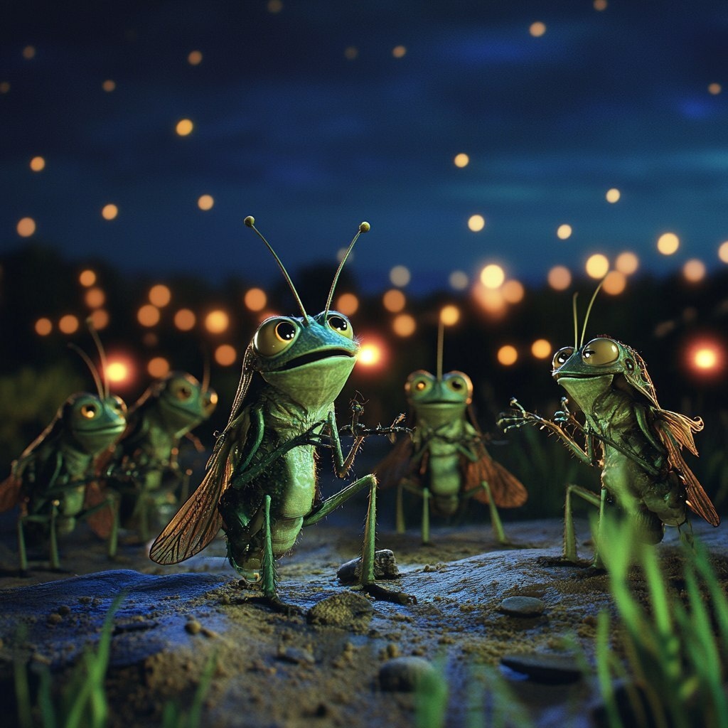 Создано на основе запроса: crickets having a concert at night, pixar style