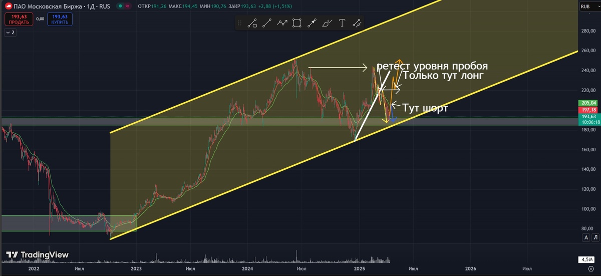 #Мосбиржа #MOEX Советую всем почитать предыдущий пост, когда мы разбирали восходящее движение и говорили что будет происходить при пробитии трендовой белой линии. Ссылка на пост- https://t.me/c/1324735280/7966