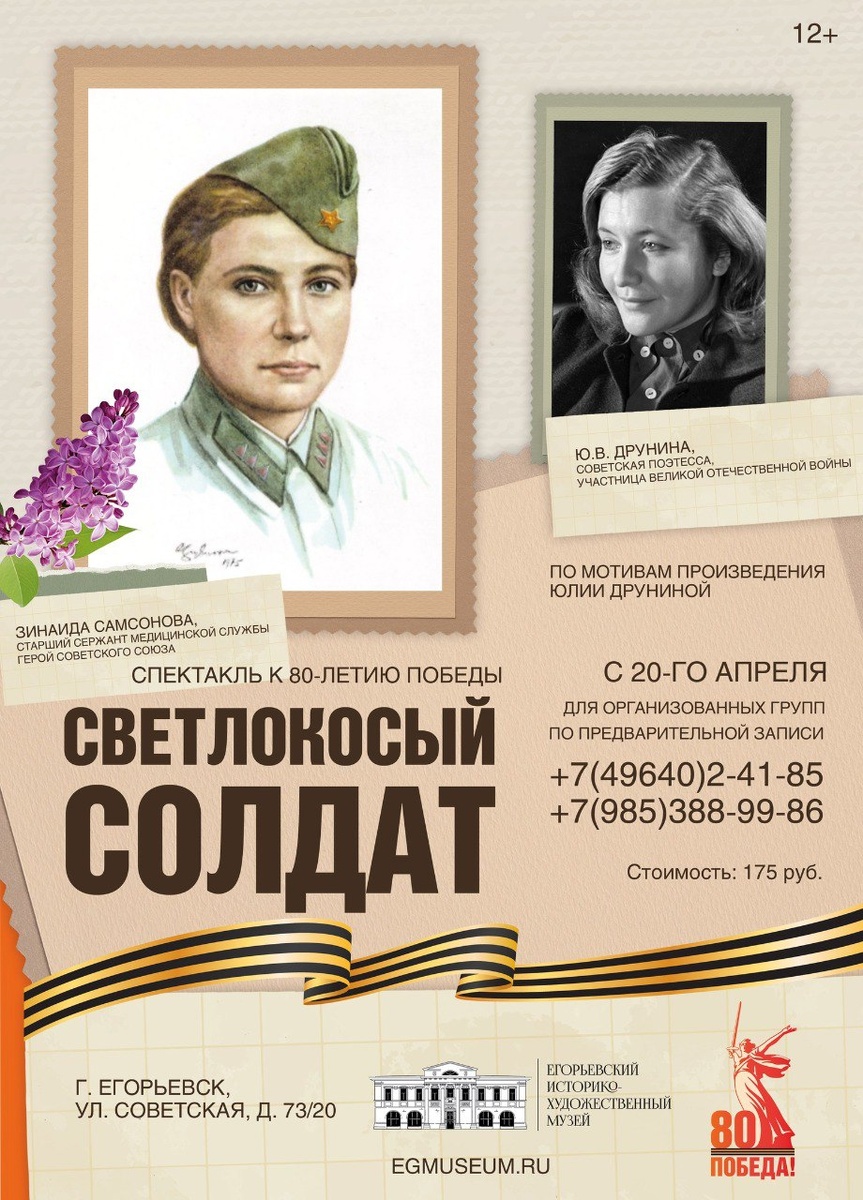 Егорьевский историко–художественный музей приглашает школьников на спектакль, посвященный героине Великой Отечественной войны Зинаиде Самсоновой. Спектакли стартуют с 20 апреля. Организационные группы принимаются по записи. Телефоны для связи: 8 (49640) 2-41-85; 8 985 388 99 86. Возрастные ограничения: 12+ #подмосковье #НашеПодмосковье #муниципальныйокругЕгорьевск #егорьевскоетелевидение #егорьевскоетв #Егорьевск #гоЕгорьевск #администрацияегорьевск