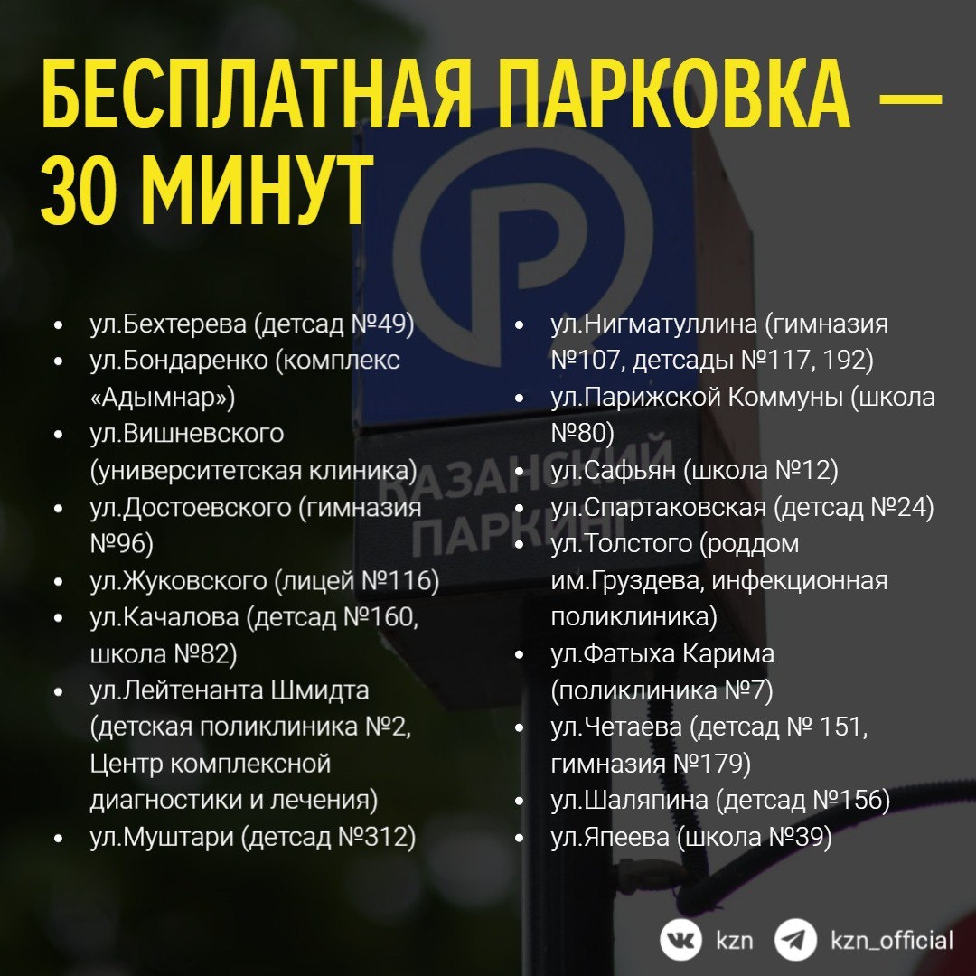 🅿️ Бесплатная парковка возле 19 соцобъектов Казани увеличена до 30 минут Проект реализован по просьбам жителей, которые приезжают за детьми в учебные и дошкольные заведения, а также сопровождают родственников в медучреждения. Изменения коснулись следующих участков 👆 📌 Также планируется увеличение бесплатного времени по ул.Товарищеской (гимназия №28), ул.Терегулова (детсад «Бала Сити») и ул.Шмидта (детсад №312 и Детская городская поликлиника №1). @kzn Больше информации в нашей группе, переходите