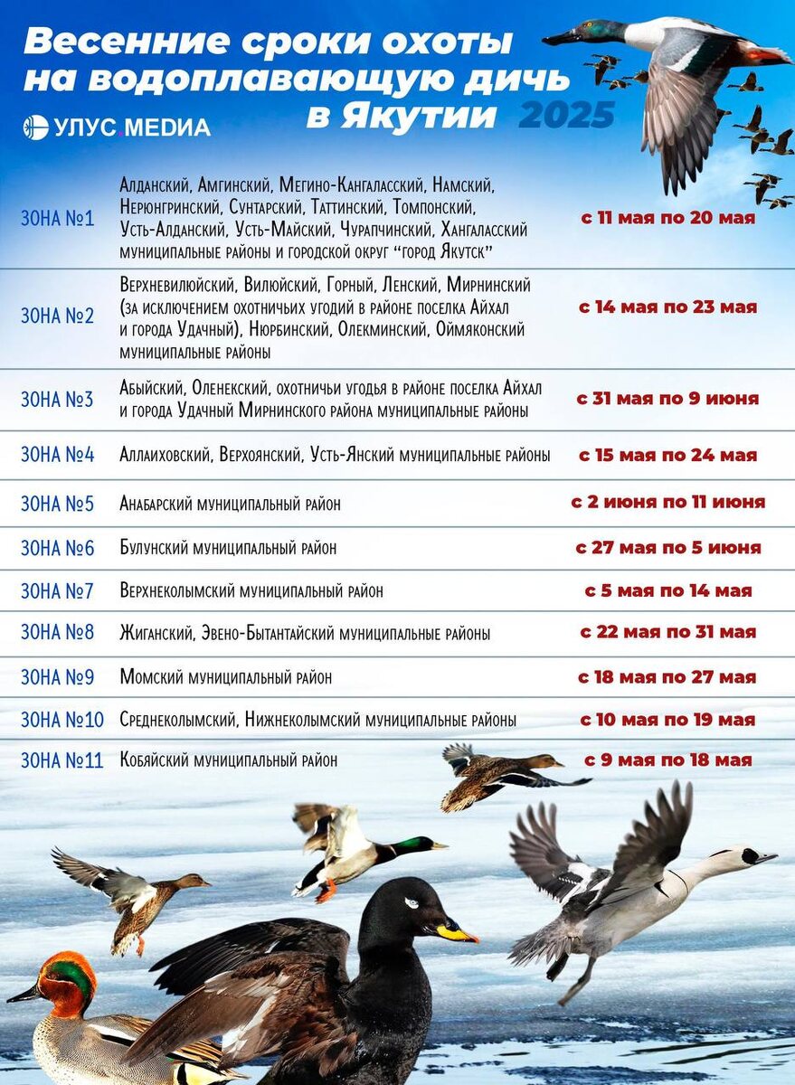 🦆 Где и когда в Якутии начнется сезон весенней охоты 2025? Подробная информация о сроках охоты на пернатую дичь представлена в нашей инфографике👆 @ulusmedia @Новости газеты «Хангалас»