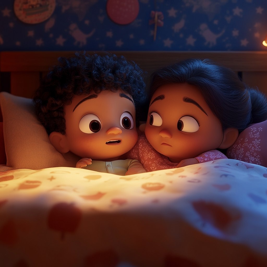Создано на основе запроса: two multiracial children wide awake in bed, pixar style