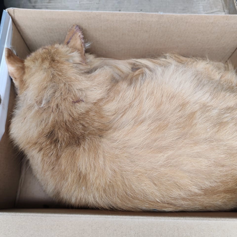 Похоже что кот провел несколько дней на мусорке, женщина, что его увидела, сначала подумала что это беременная кошка... Женщина, которая нашла кота, содержит много собак, ну типа мини-приют. Условий нет совсем, она почти одна в поле живёт и выхаживать кота совсем нет возможности, целый день с собаками, но она не бросила котика, а отвезла в клинику и частично сама оплатила операцию. Она обратилась к Валентине и та не отказала, а как отказать?! Кот был в жутком состоянии, блохастый, в колючках и колтунах, как нам сказали врачи и поэтому обрили его наголо, сбрили даже усы... Вообще это ненормально, кошек категорически нельзя брить наголо, для них это сильный стресс! Но как нам объяснили так надо было, потому что опе'рация была на верхней челюсти и надо было чтобы всё было доступно и стерильно. Еще сказали, что глаз надо будет показать офтальмологу. У кота разорвано нёбо внутри. У него г'ной в носу, во рту и ушах, всё промыли, прочистили. Назвали его Князь. Котика прооперировали. В горле