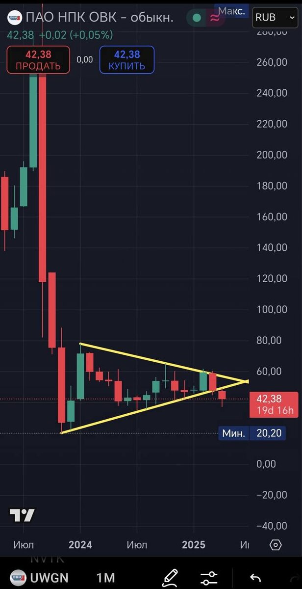 🚂ОВК: скрытая опасность и ключевые уровни для осторожных инвесторов! $UWGN ОВК знаю в пульсе любят эту компанию, Она вроде как на дне, Но, открою многим глаза, они размыли капитал в 2023 году в 29 раз по цене акции 9,3 руб, Таким образом текущую цену 42₽ умножайте на 29, получается покупая ОВК сейчас, вы делаете это, по 1218₽ По абсолютному хаю. 10 дней назад, писал здесь пост про ОВК, Предупреждал, о выходе из треугольника вниз, Тогда цена была 50₽ В итоге, за 10 дней, ушли вниз на 15%, Что дальше? Посмотрите на месячные свечи, Мы находимся в безумной волатильности, Покупать в среднесрок или долгосрок опасно, Если очень хочется, лонгануть, Нужно дождаться успокоения графика, Дождитесь когда свечи станут менее амплитудными и цена уйдёт в накопление, на каких отметках это будет, Думаю мы узнаем ближе к лету, Но 34.30₽ сильнейший уровень в этой бумаге.