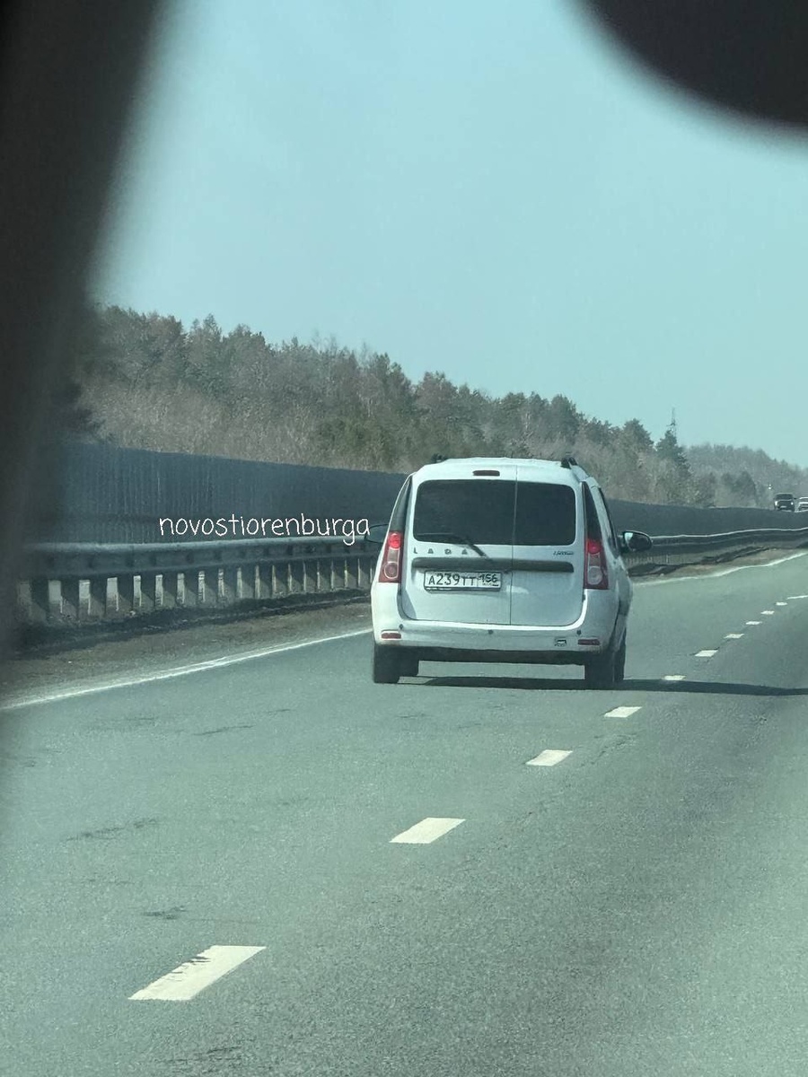 Белый ларгус ГРЗ А239ТТ156 курсирует по трассе Оренбург - Илек и фиксирует скорость встречных автомобилей, радар в багажнике за тонировкой