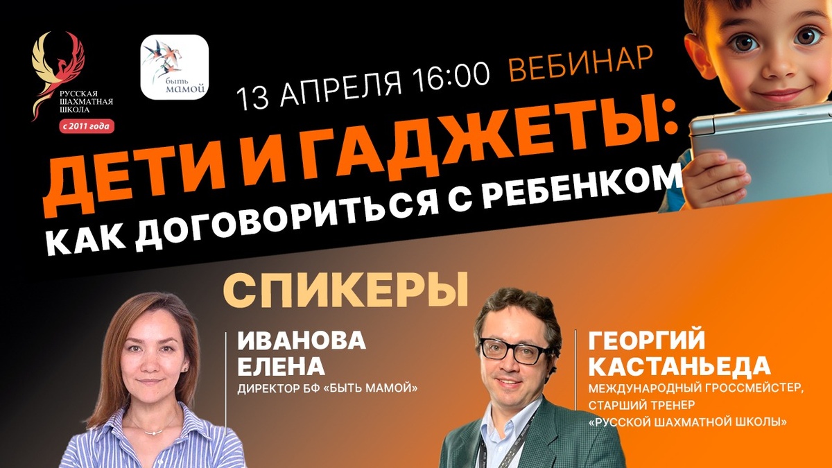 Готовы к инсайтам? Приглашаем на бесплатный вебинар 13 апреля в 16:00 О чём поговорим? - Эпоха зумеров: почему гаджеты их второй мир. - Онлайн обучение: почему это увлекательно и удобно, но требует баланса. - Психология "залипания": что тянет детей к экранам. - Правила без ссор: как договориться с юным техно-героем. - Лайфхаки для родителей: от таймеров до оффлайн-приключений. - Семейный вайб: экран VS реал Для кого? Родители, которые хотят понять мир технологий зумеров и найти баланс. Итог: Гаджеты - помощники, а не проблема. Чёткие шаги к гармонии! Спикеры: Иванова Елена, директор БФ «Быть мамой» Георгий Кастаньеда, международный гроссмейстер, старший тренер «Русской Шахматной Школы» Участие бесплатно, необходима регистрация: (через https://web.telegram.org/k/#@ZoomBreakfastBot) Ссылка на эфир вам поступит после регистрации, за полчаса до начала. Ждём родителей юных & прогрессивных и всех, кому интересна тема!